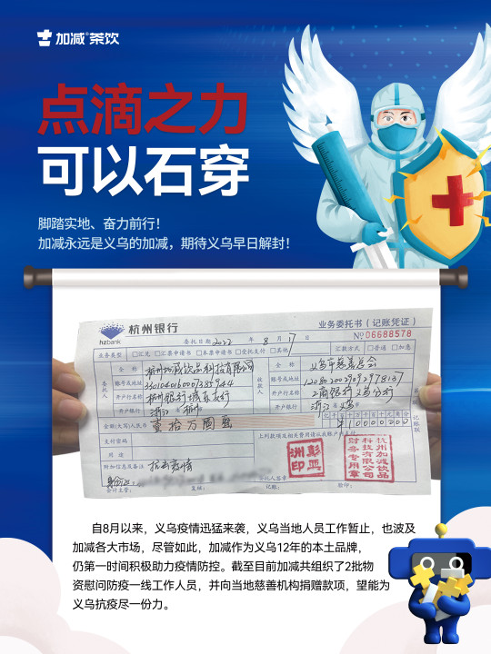 2022年8月11月,因义乌突如其来的疫情,整座城市按下了暂停键,全民进入静默期。在这场新冠肺炎疫情爆发期间,作为深耕义乌发展12年的k8凯发茶饮,主动发扬本土企业的社会担当和责任。截至2022年8月17日,公司共组织了2批物资慰问一线人员,并向当地慈善机构捐赠爱心款项。脚踏实地、奋力前行!k8凯发以实际行动为打赢疫情防控战贡献力量!